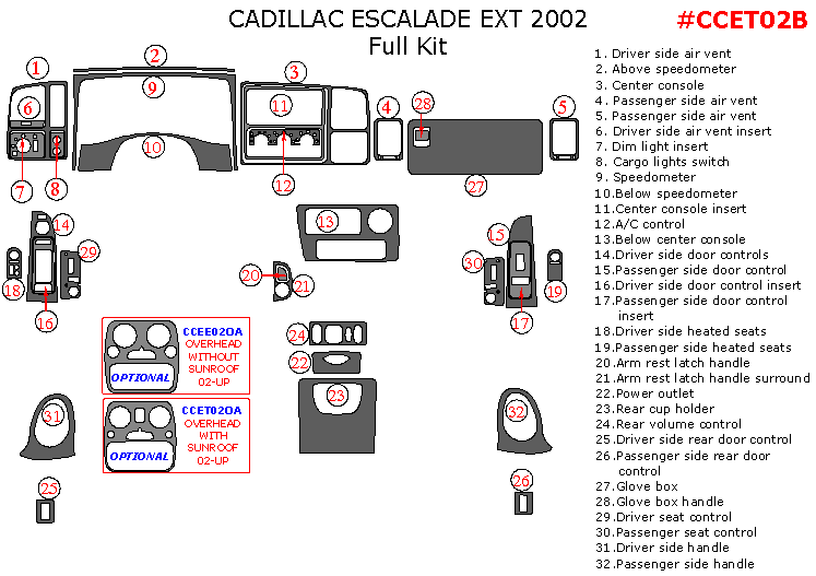 Cadillac Escalade 2002, EXT, Full Interior Kit, 32 Pcs. OEM Match