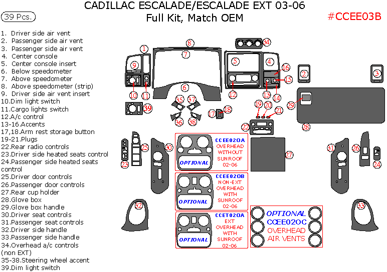 We offer a wide variety of colors and materials of Cadillac Escalade/Escalade EXT 2003, 2004, 2005, 2006, Full Interior Kit, 39 Pcs., Match OEM. Choose your favourite option and place an order.