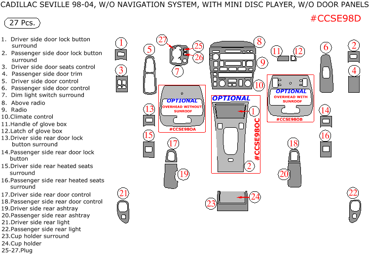 Cadillac Seville 1998, 1999, 2000, 2001, 2002, 2003, 2004, Interior Kit, W/o Navigation System, With Mini Disc Player, W/o Door Panels, 27 Pcs., Match OEM