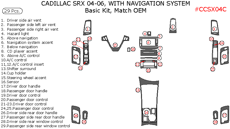 Cadillac SRX 2004, 2005, 2006, Basic Interior Kit, With Navigation System, 29 Pcs., Match OEM