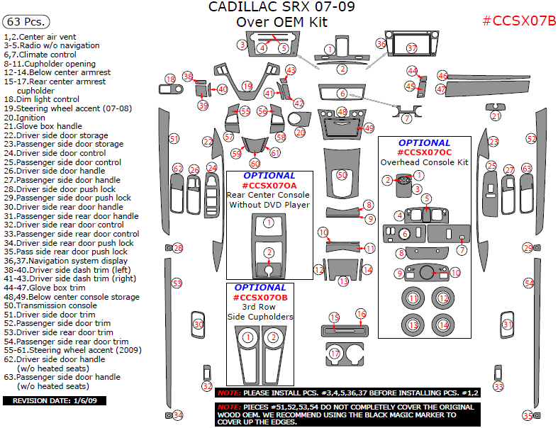 Cadillac SRX 2007, 2008, 2009, Interior Kit, Over OEM Kit, 63 Pcs.