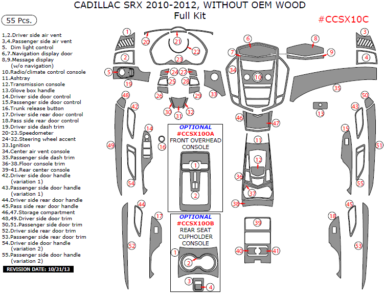 Cadillac SRX 2010, 2011, 2012, Full Interior Kit (Without OEM Wood), 55 Pcs.