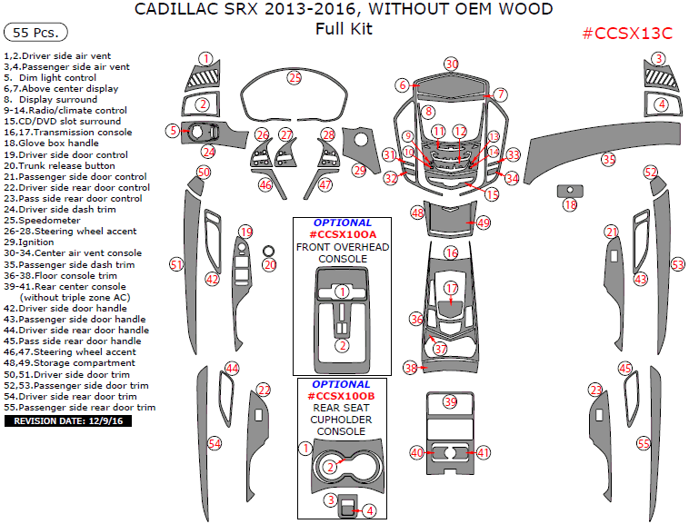 Cadillac SRX 2013, 2014, 2015, 2016, Full Interior Kit (Without OEM Wood), 55 Pcs.