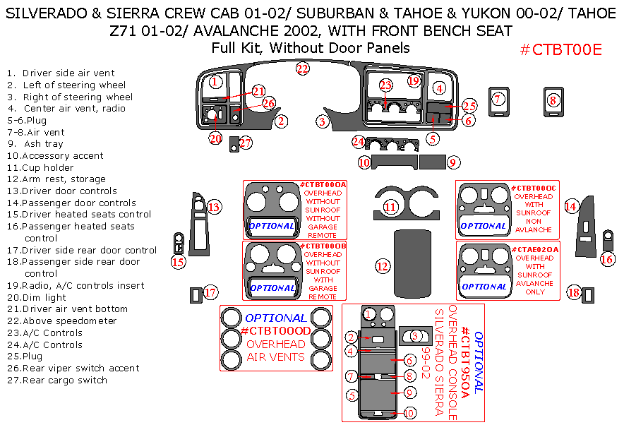 Chevrole Tahoe/Avalanche/Suburban 2000, 2001, 2002, GMC Sierra 1999-2002 / Yukon 2000-2002, With Front Bench Seats, Full Interior Kit, Without Door Panels 27 Pcs.