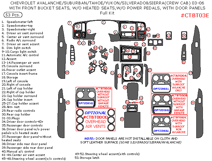 Chevrolet Avalanche/Silverado/Suburban/Tahoe 2003, 2004, 2005, 2006, GMC Sierra/Yukon, With Front Bucket Seats, Without Heated Seats, Without Power Pedals, Full Interior Kit, With Door Panels, 53 Pcs.