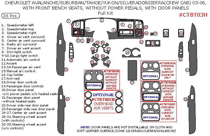 Chevrolet Avalanche/Silverado/Suburban/Tahoe 2003, 2004, 2005, 2006, GMC Sierra/Yukon 2003-2006, With Front Bench Seat, Without Power Pedals, Full Interior Kit, With Door Panels, 35 Pcs.