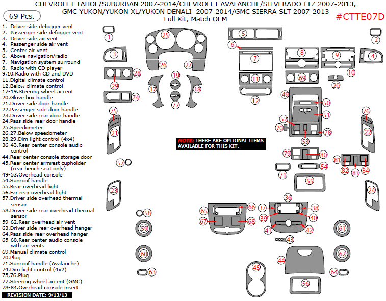 Chevrolet Tahoe/Suburban 2007, 2008, 2009, 2010, 2011, 2012, 2013, 2014/Chevrolet Avalanche/Silverado LTZ 2007-2013, GMC Yukon/Yukon XL/Yukon Denali 2007-2014/GMC Sierra SLT 2007-2013, Full Interior Kit, 69 Pcs., With OEM Match, Match OEM