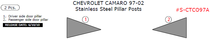 We offer a wide variety of colors and materials of Chevrolet Camaro 1997, 1998, 1999, 2000, 2001, 2002, Stainless Steel Pillar Posts, 2 Pcs. Choose your favourite option and place an order.