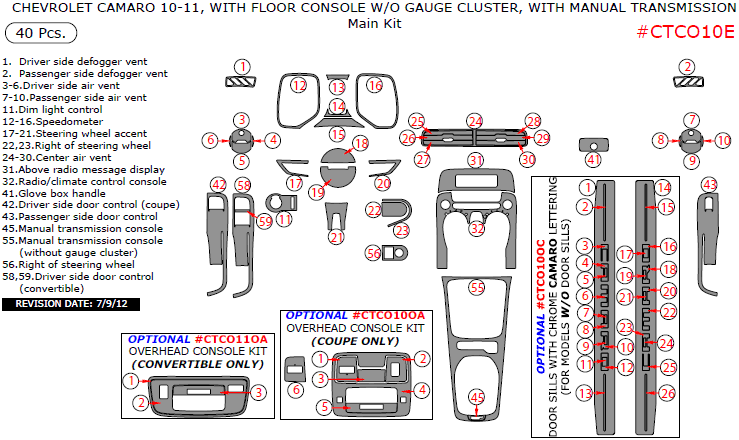 Chevrolet Camaro 2010-2011, With Floor Console Without Gauge Cluster, With Manual Transmission, Main Interior Kit, 40 Pcs.