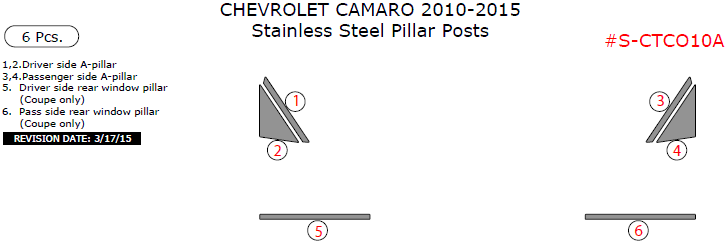 Chevrolet Camaro 2010, 2011, 2012, 2013, 2014, 2015, Stainless Steel Pillar Posts, 6 Pcs.
