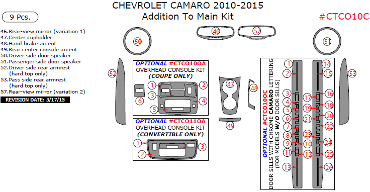 Chevrolet Camaro 2010, 2011, 2012, 2013, 2014, 2015, Addition To Main Interior Kit, 9 Pcs.