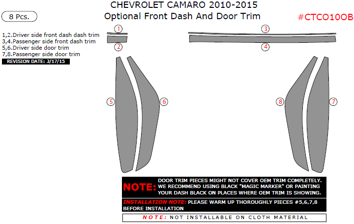 Chevrolet Camaro 2010, 2011, 2012, 2013, 2014, 2015, Optional Front Dash And Door Interior Trim Kit, 8 Pcs.