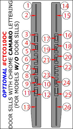 Chevrolet Camaro 2010, 2011, 2012, 2013, 2014, 2015, Interior Kit, Optional Door Sills With Chrome "Camaro" Lettering (For Models W/o Door Sills), 26 Pcs.