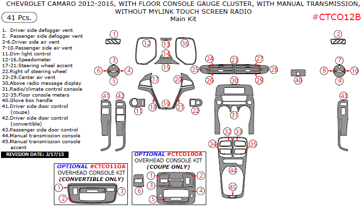 Chevrolet Camaro 2012, 2013, 2014, 2015, With Floor Console Gauge Cluster, With Manual Transmission, Without MyLink Touch Screen Radio, Main Interior Kit, 41 Pcs.