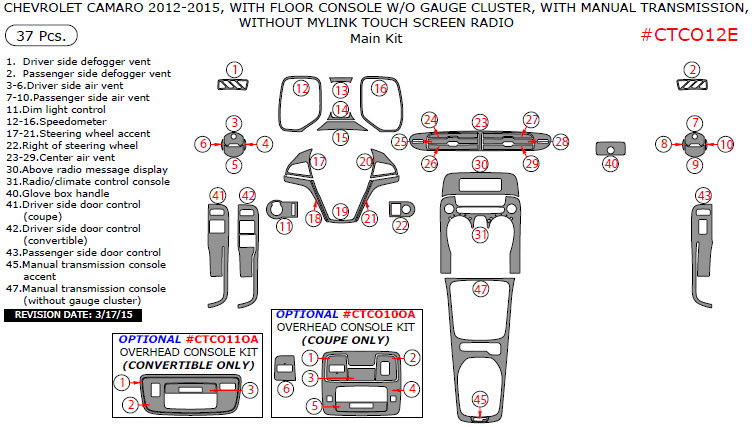Chevrolet Camaro 2012, 2013, 2014, 2015, With Floor Console Without Gauge Cluster, With Manual Transmission, Without MyLink Touch Screen Radio, Main Interior Kit, 37 Pcs.