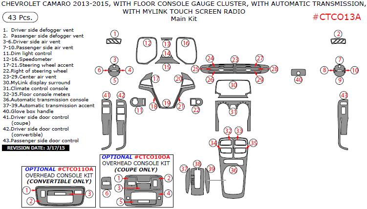 Chevrolet Camaro 2013, 2014, 2015, With Floor Console Gauge Cluster, With Automatic Transmission, With MyLink Touch Screen Radio, Main Interior Kit, 43 Pcs.