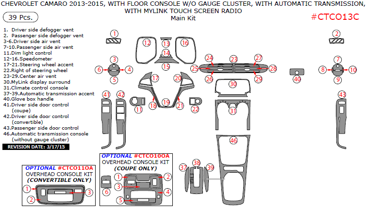 Chevrolet Camaro 2013, 2014, 2015, With Floor Console Without Gauge Cluster, With Automatic Transmission, With MyLink Touch Screen Radio, Main Interior Kit, 39 Pcs.