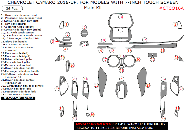 Chevrolet Camaro 2016, 2017, 2018, 2019, 2020, 2021, 2022, 2023, 2024, 2025 For Models With 7-Inch Touch Screen, Main Interior Kit, 36 Pcs.