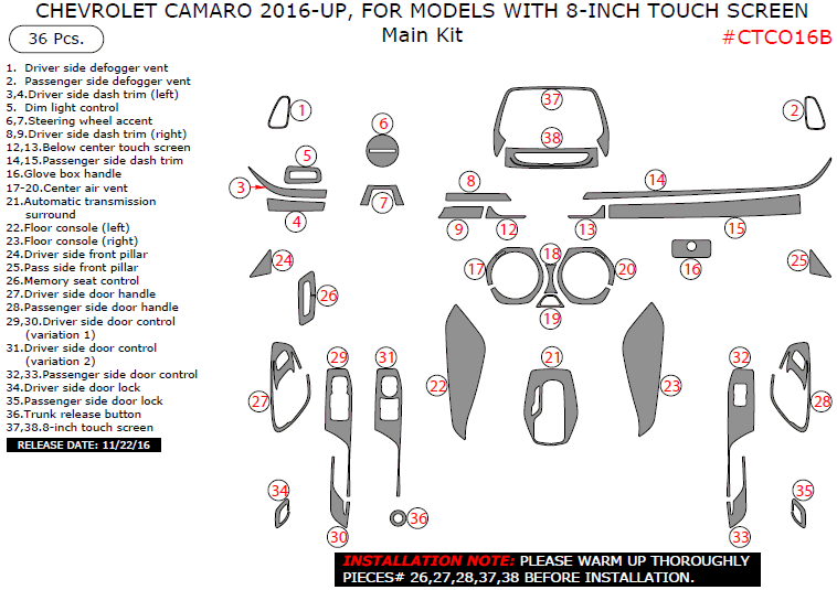 Chevrolet Camaro 2016, 2017, 2018, 2019, 2020, 2021, 2022, 2023, 2024, 2025 For Models With 8-Inch Touch Screen, Main Interior Kit, 36 Pcs.