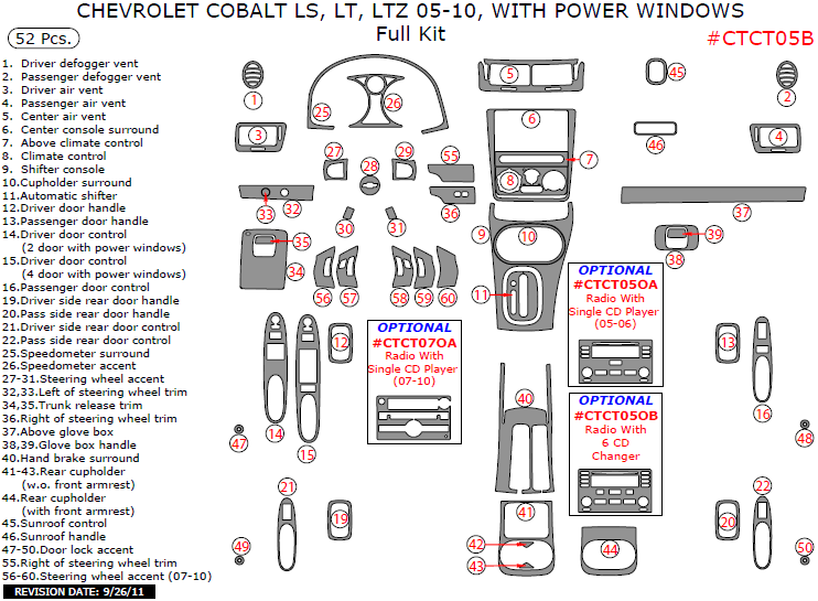 Full interior dash kit of 52 pieces for Chevrolet Cobalt 2005, 2006, 2007, 2008, 2009, 2010, LS, LT, LTZ with power windows is available in a number of colors (black, red, etc.) and materials (ebony, carbon fiber, etc.). We offer high quality 2005-2010 Chevy Cobalt interior accessories, so pick your favourite option and buy the chosen dash trim kit.