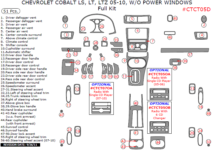 Chevrolet Cobalt 2005, 2006, 2007, 2008, 2009, 2010, LS, LT, LTZ Without Power Windows, Full Interior Kit, 51 Pcs.