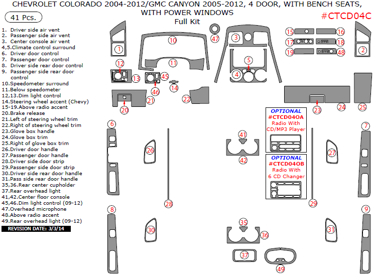Chevrolet Colorado 2004, 2005, 2006, 2007, 2008, 2009, 2010, 2011, 2012, GMC Canyon 2005-2012, 4 Door, With Bench Seats, With Power Windows, Full Interior Kit, 41 Pcs.