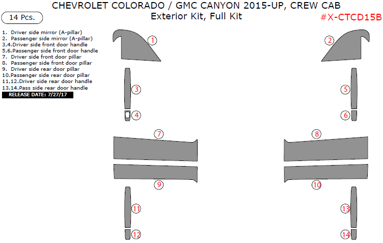 Chevrolet Colorado / GMC Canyon 2015, 2016, 2017, 2018, 2019, 2020, 2021, 2022 Crew Cab, Exterior Kit, Full Interior Kit, 14 Pcs.