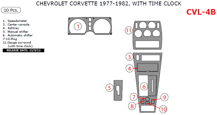 Chevrolet Corvette 1977, 1978, 1979, 1980, 1981, 1982, With Time Clock, Main Interior Kit, 10 Pcs.