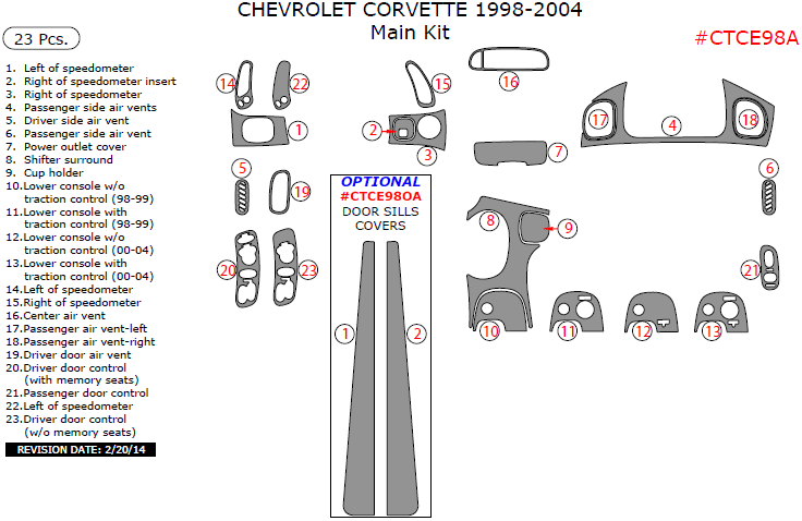Chevrolet Corvette 1998, 1999, 2000, 2001, 2002, 2003, 2004, Main Interior Kit, 23 Pcs.