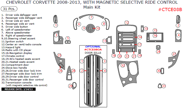 Chevrolet Corvette 2008, 2009, 2010, 2011, 2012, 2013, With Magnetic Selective Ride Control, Main Interior Kit, 31 Pcs.