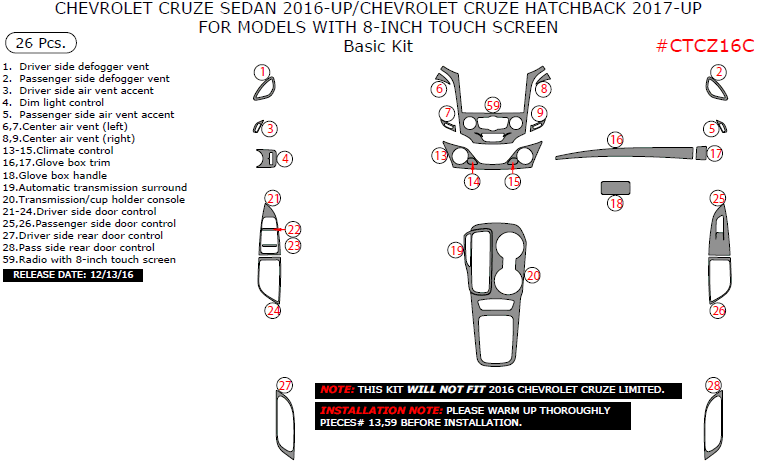 Chevrolet Cruze Sedan 2016, 2017, 2018, 2019/Chevrolet Cruze Hatchback 2017-2019, For Models With 8-Inch Touch Screen, Basic Interior Kit, 26 Pcs.