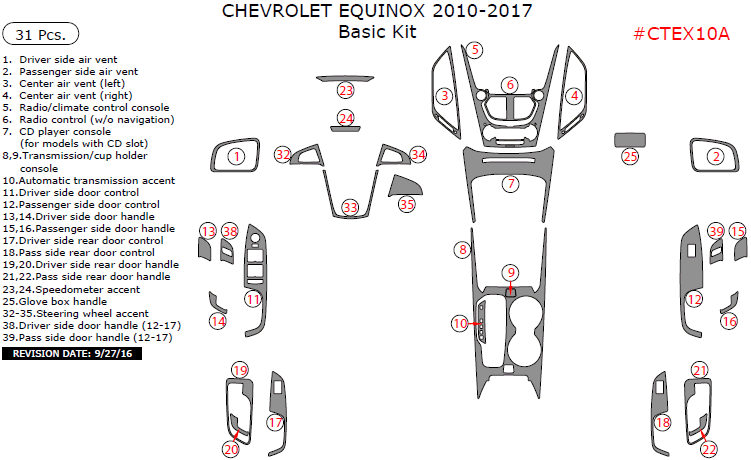 Chevrolet Equinox 2010, 2011, 2012, 2013, 2014, 2015, 2016, 2017, Basic Interior Kit, 31 Pcs.