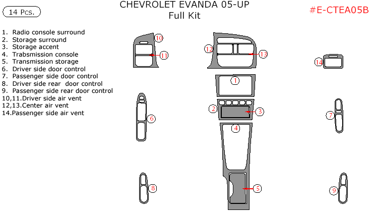 Chevrolet Evanda 2005, 2006, 2007, 2008, 2009, 2010, 2011, 2012, 2013, 2014, 2015, Chevrolet Evanda 2005-2015, Full Interior Kit, 14 Pcs.
