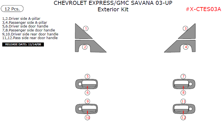 Chevrolet Express/GMC Savana 2003, 2004, 2005, 2006, 2007, 2008, 2009, 2010, 2011, 2012, 2013, 2014, 2015, Exterior Kit, 12 Pcs.