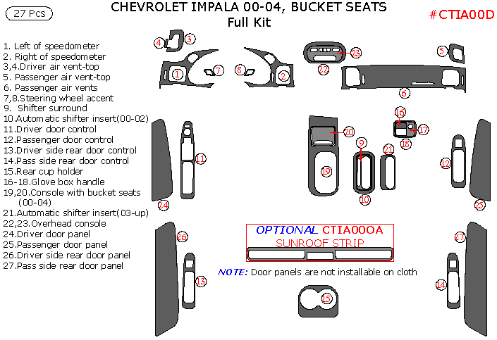 Chevrolet Impala 2000, 2001, 2002, 2003, 2004, Bucket Seats, Full Interior Kit, 27 Pcs., Match OEM