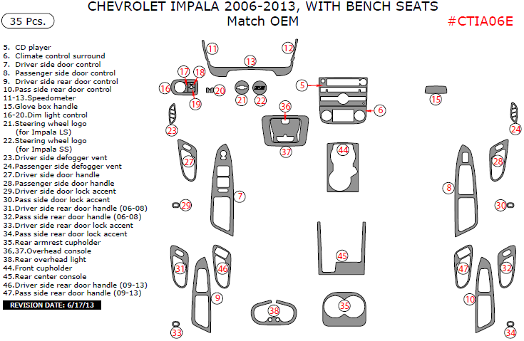 We offer a wide variety of colors and materials of Chevrolet Impala 2006, 2007, 2008, 2009, 2010, 2011, 2012, 2013, With Bench Seats, Full Interior Kit, 35 Pcs. Match OEM. Choose your favourite option and place an order.