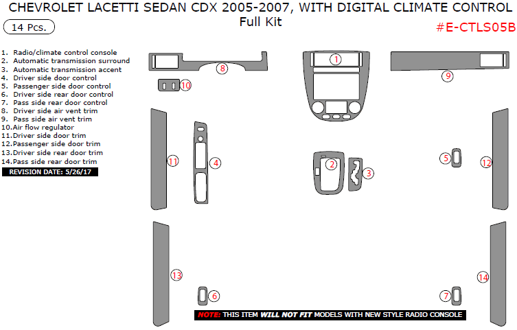 Chevrolet Lacetti Sedan CDX 2005, 2006, 2007, With Digital Climate Control, Full Interior Kit, 14 Pcs.