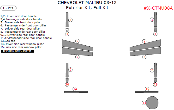 Chevrolet Malibu 2008, 2009, 2010, 2011, 2012, Exterior Kit, Full Interior Kit, 15 Pcs.