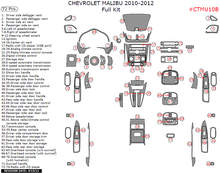 Chevrolet Malibu 2010, 2011, 2012, Full Interior Kit, 72 Pcs.