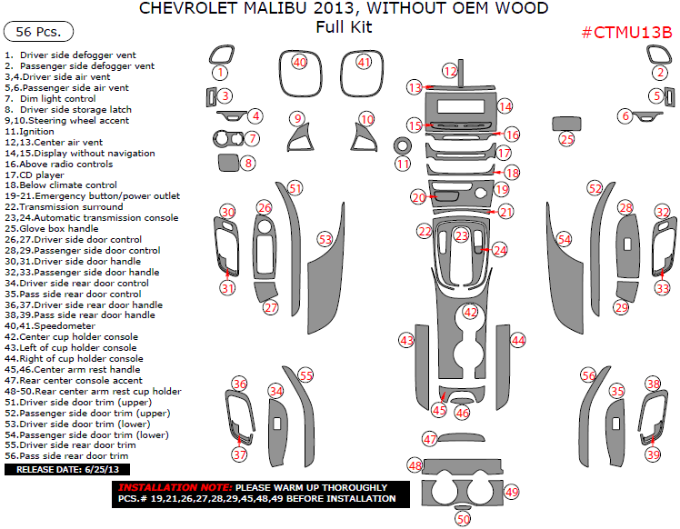 Chevrolet Malibu 2013, Without OEM Wood, Full Interior Kit, 56 Pcs.