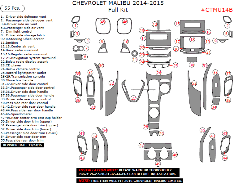 Chevrolet Malibu 2014-2015, Full Interior Kit, 55 Pcs.