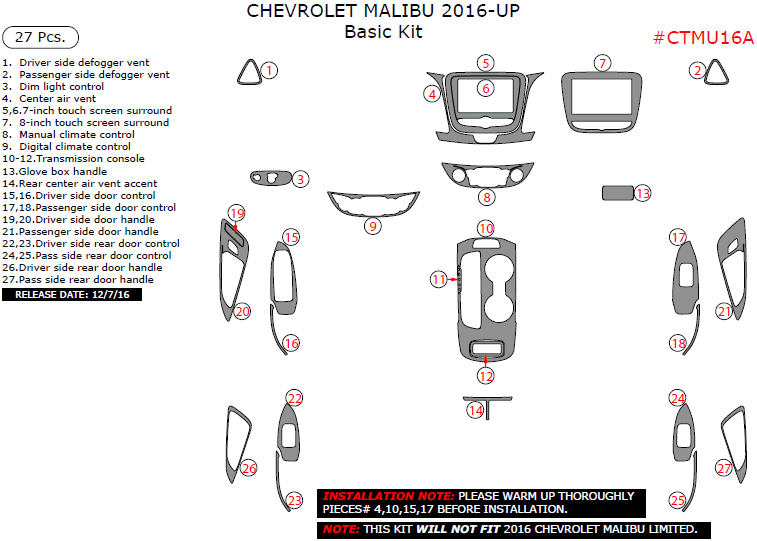 Chevrolet Malibu 2016, 2017, 2018, 2019, 2020, 2021, 2022, 2023, 2024, 2025 Basic Interior Kit, 27 Pcs.