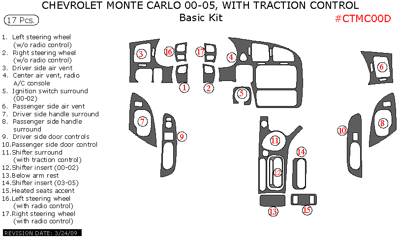 Chevrolet Monte Carlo 2000, 2001, 2002, 2003, 2004, 2005, Basic Interior Kit, With Traction Control, 17 Pcs.