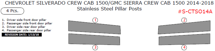 Chevrolet Silverado Crew Cab 1500/GMC Sierra Crew Cab 1500 2014, 2015, 2016, 2017, 2018, Stainless Steel Pillar Posts, 4 Pcs.