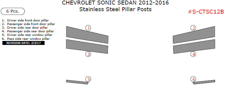 Chevrolet Sonic Sedan 2012, 2013, 2014, 2015, 2016, Stainless Steel Pillar Posts, 6 Pcs.