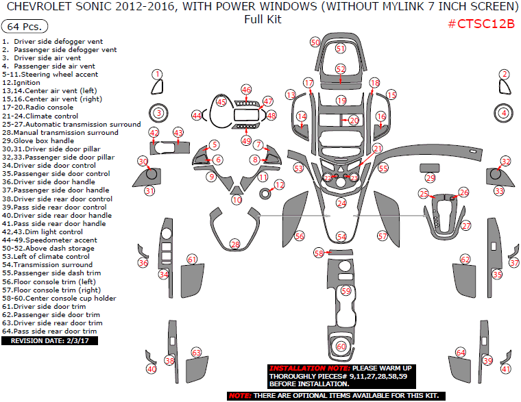 Chevrolet Sonic 2012, 2013, 2014, 2015, 2016, With Power Windows (Without MyLink 7 Inch Screen), Full Interior Kit, 64 Pcs.
