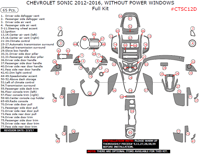 Chevrolet Sonic 2012, 2013, 2014, 2015, 2016, Without Power Windows, Full Interior Kit, 65 Pcs.