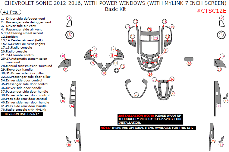 Chevrolet Sonic 2012, 2013, 2014, 2015, 2016, With Power Windows (With MyLink 7 Inch Screen), Basic Interior Kit, 41 Pcs.