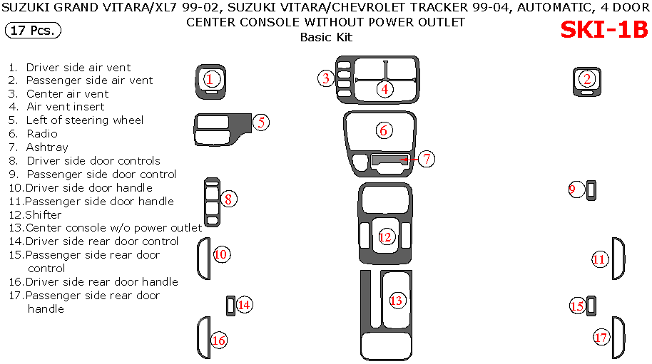 We offer a wide variety of colors and materials of Chevrolet Tracker 1999, 2000, 2001, 2002, 2003, 2004, Suzuki Grand Vitara/XL-7 1999, 2000, 2001, 2002, Suzuki Vitara 1999, 2000, 2001, 2002, 2003, 2004, Automatic, 4 Door, Center Console W/o Power Outlet, Basic Interior Kit, 17 Pcs. Choose your favourite option and place an order.