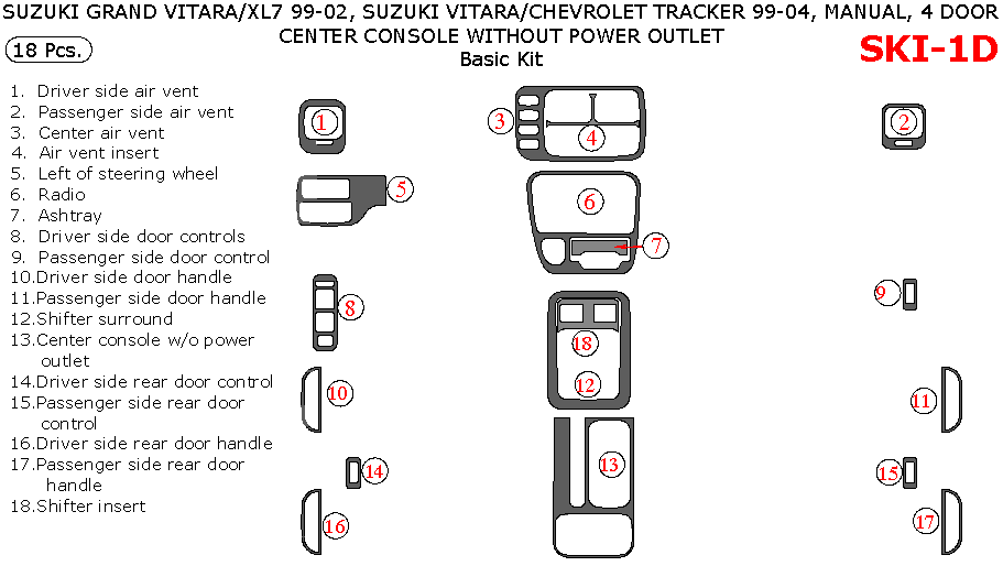 Chevrolet Tracker 1999, 2000, 2001, 2002, 2003, 2004, Suzuki Grand Vitara/XL-7 1999-2002, Suzuki Vitara 1999-2004, Manual, 4 Door, Center Console W/o Power Outlet, Full Interior Kit, 18 Pcs.
